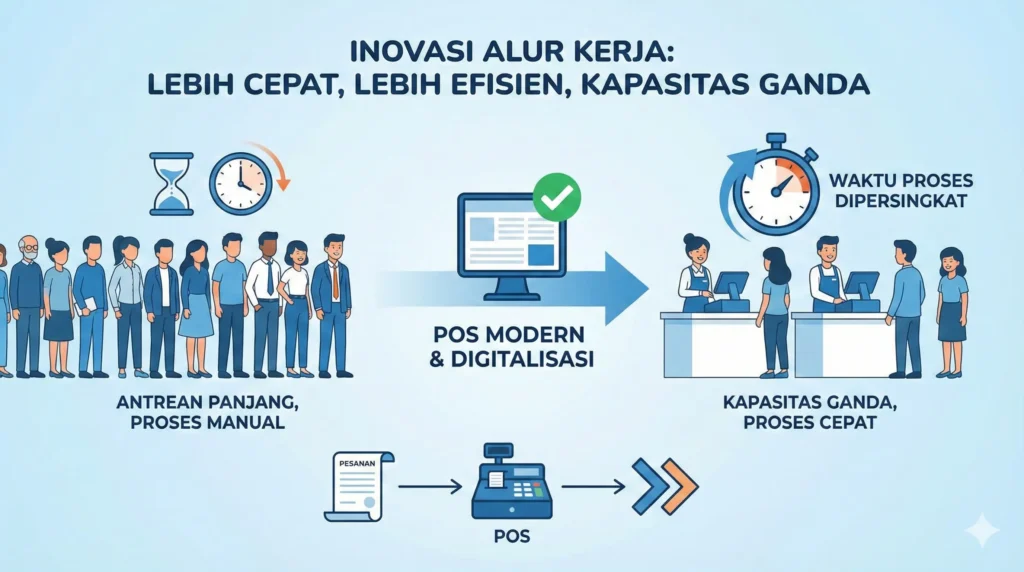 Kecepatan pelayanan secara langsung berkorelasi dengan efisiensi operasional bisnis Anda. Dengan proses yang cepat, Anda mengurangi antrean dan waktu tunggu. Ambil contoh bisnis kuliner: Jika waktu rata-rata pelayanan per pelanggan dapat dipotong dari 15 menit menjadi 8 menit, Anda hampir melayani dua kali lipat pelanggan dalam periode waktu yang sama. Ini disebut turnover meja atau pelanggan yang lebih cepat, sebuah kunci yang langsung berbanding lurus dengan peningkatan omzet tanpa perlu menambah banyak sumber daya.