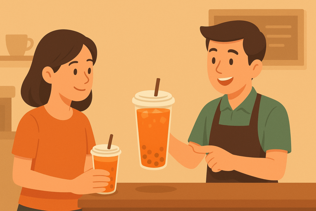 - Di Gerai Minuman: Pelanggan memesan Thai Tea ukuran reguler. Kasir bisa berkata, “Nambah dua ribu rupiah saja sudah bisa dapat ukuran Large yang lebih puas, Kak. Mau coba?”