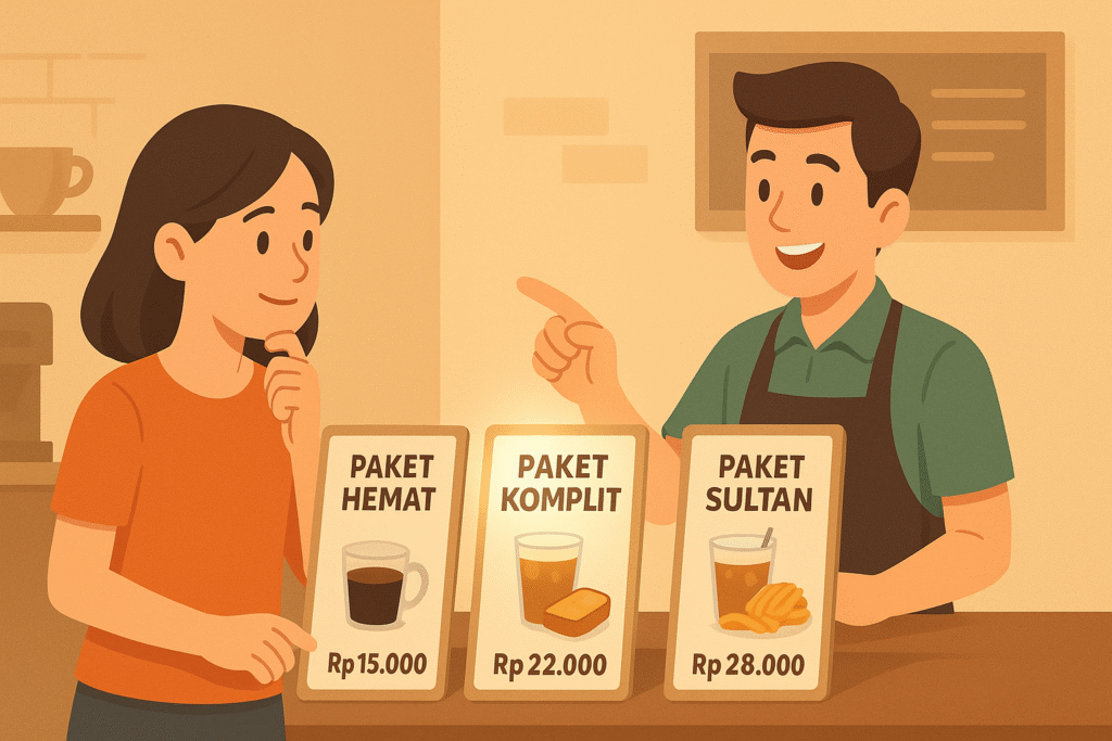 Mengapa ini berhasil? Dengan menyusun pilihan seperti ini, Anda secara tidak langsung mengarahkan pelanggan ke “Paket Komplit”. Pilihan ini terlihat jauh lebih menguntungkan dibandingkan “Paket Hemat” dan tidak semahal “Paket Sultan”.